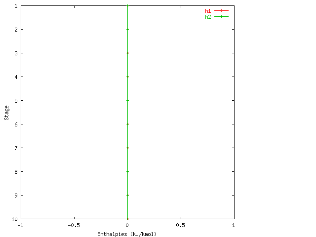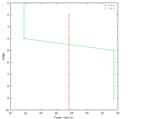 Mass and Energy Balances Stream / Apparatus Mass (mol/s) Energy (MW) Exergy (MW) Feed 1 11.75 0.0000 -0.8236 Top -5.873 -0.0000 0.3601 Bottom -5.874 -0.0000 0.4581 Condenser Duty 0.0000 0.0000 Reboiler Duty 0.0000 0.0000 ----------- + ----------- + ----------- + Balance -3.958E-05 0.0000 -0.005415 Thermodynamic efficiency = -0.0000 Component discrepancies (mol/s) Benzene -1.722E-05 Toluene -1.929E-05 Stage Temperature Pressure Flow rates (mol/s) ( C) (bar) Liquid Vapour Feed Product 1 85.09 1.115 11.75 5.873 L 2 87.14 1.115 11.75 17.62 3 89.85 1.115 11.75 17.62 4 92.88 1.115 11.75 17.62 5 95.71 1.115 23.49 17.62 11.75 6 98.02 1.115 23.49 17.62 7 101.1 1.115 23.49 17.62 8 104.7 1.115 23.49 17.62 9 108.0 1.115 23.49 17.62 10 110.6 1.115 17.62 5.874 L Profile for Toluene Stage Liquid (-) Vapour (-) K (-) 1 0.07432 0.03065 0.4124 2 0.1683 0.07432 0.4415 3 0.2839 0.1370 0.4825 4 0.4023 0.2140 0.5320 5 0.5037 0.2930 0.5817 6 0.5807 0.3630 0.6251 7 0.6772 0.4658 0.6878 8 0.7771 0.5943 0.7648 9 0.8628 0.7276 0.8432 10 0.9256 0.8419 0.9096 Profile for Toluene Stage Liquid (-) Vapour (-) K (-) 1 0.07432 0.03065 0.4124 2 0.1683 0.07432 0.4415 3 0.2839 0.1370 0.4825 4 0.4023 0.2140 0.5320 5 0.5037 0.2930 0.5817 6 0.5807 0.3630 0.6251 7 0.6772 0.4658 0.6878 8 0.7771 0.5943 0.7648 9 0.8628 0.7276 0.8432 10 0.9256 0.8419 0.9096 Stream Feed 1 Top Bottom Stage 5 1 10 Pressure (bar) 1.115 1.115 1.115 Vapour fraction (-) 0.0000 0.0000 0.0000 Temperature ( C) 95.60 85.09 110.6 Enthalpy (kJ/kmol) 0.0000 0.0000 0.0000 Entropy (J/kmol/K) 2.352E+05 2.057E+05 2.616E+05 Mole flows (mol/s) Benzene 5.874 5.437 0.4369 Toluene 5.874 0.4365 5.437 Total molar flow 11.75 5.873 5.874 Mole fractions (-) Benzene 0.5000 0.9257 0.07438 Toluene 0.5000 0.07432 0.9256 Mass flows (kg/s) Benzene 0.4588 0.4247 0.03413 Toluene 0.5412 0.04022 0.5010 Total mass flow 1.0000 0.4649 0.5351 Mass fractions (-) Benzene 0.4588 0.9135 0.06378 Toluene 0.5412 0.08651 0.9362