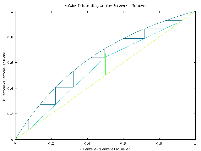 Column C:\CHEMSEP\BT1.SEP Components: Benzene Toluene Operation: Simple Distillation Total (Liquid product) Condenser Partial (Liquid product) Reboiler 10 Stages Feeds to stages 5 |----| |------>-----| | | |1 | | |--|------| |--|-| | | |----<-------->- |--|---|--| |--|---|--| ----->----5-|--|---|--| |--|---|--| |--|---|--| | |---|-----<----| |------|--| |--|-| |--->---------->- 10|----| Properties: Raoult's law K model Antoine Vapour pressure None Enthalpy Enthalpy reference state Vapour Enthalpy reference temperature 25.00 ( C) Formation enthalpies Excluded Exergy surroundings temperature 25.00 ( C) Reactions: Specifications: Column pressure Condenser pressure 1.115 (bar) Top pressure 1.115 (bar) Default efficiency = 1.000 (-) Feed 1 Stage 5 Pressure (bar) 1.115 Enthalpy (kJ/kmol) Vapour fraction (-) 0.0000 Temperature ( C) Component flows (mol/s) Benzene 5.874 Toluene 5.874 Condenser Reflux ratio = 2.000 (-) Initialization guess: * Reboiler Bottom product flow rate = 5.874 (mol/s) Initialization guess: * Solve options: Automatic Initialization Newton's method Flow Step limit 0.5000 (-) Temperature Step limit 10.00 ( C) Composition Step limit 1.000 (-) Accuracy = 0.0001 Maximum iterations = 30 Feeds type = Stage below User program = CSW
