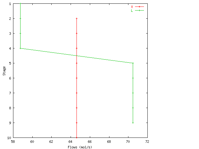 Column C:\CHEMSEP\BT3.SEP Components: Benzene Toluene Operation: Simple Distillation Total (Liquid product) Condenser Partial (Liquid product) Reboiler 10 Stages Feeds to stages 5 |----| |------>-----| | | |1 | | |--|------| |--|-| | | |----<-------->- |--|---|--| |--|---|--| ----->----5-|--|---|--| |--|---|--| |--|---|--| | |---|-----<----| |------|--| |--|-| |--->---------->- 10|----| Properties: Raoult's law K model Antoine Vapour pressure None Enthalpy Enthalpy reference state Vapour Enthalpy reference temperature 25.00 ( C) Formation enthalpies Excluded Exergy surroundings temperature 25.00 ( C) Reactions: Specifications: Column pressure Condenser pressure 1.115 (bar) Top pressure 1.115 (bar) Default efficiency = 1.000 (-) Feed 1 Stage 5 Pressure (bar) 1.115 Enthalpy (kJ/kmol) Vapour fraction (-) 0.0000 Temperature ( C) Component flows (mol/s) Benzene 5.874 Toluene 5.874 Condenser Reflux ratio = 10.00 (-) Initialization guess: * Reboiler Bottom product flow rate = 5.874 (mol/s) Initialization guess: * Solve options: Automatic Initialization Newton's method Flow Step limit 0.5000 (-) Temperature Step limit 10.00 ( C) Composition Step limit 1.000 (-) Accuracy = 0.0001 Maximum iterations = 30 Feeds type = Stage below User program = CSW