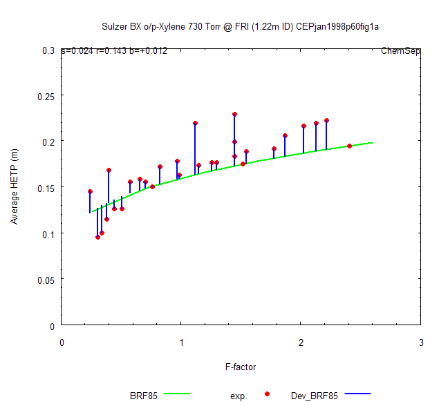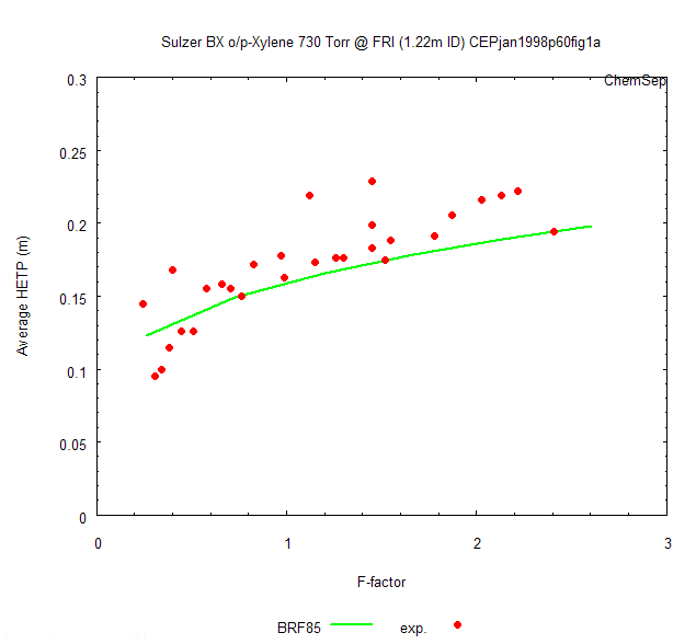 The BRF'85 prediction with the FRI experimental data for Sulzer BX packing with